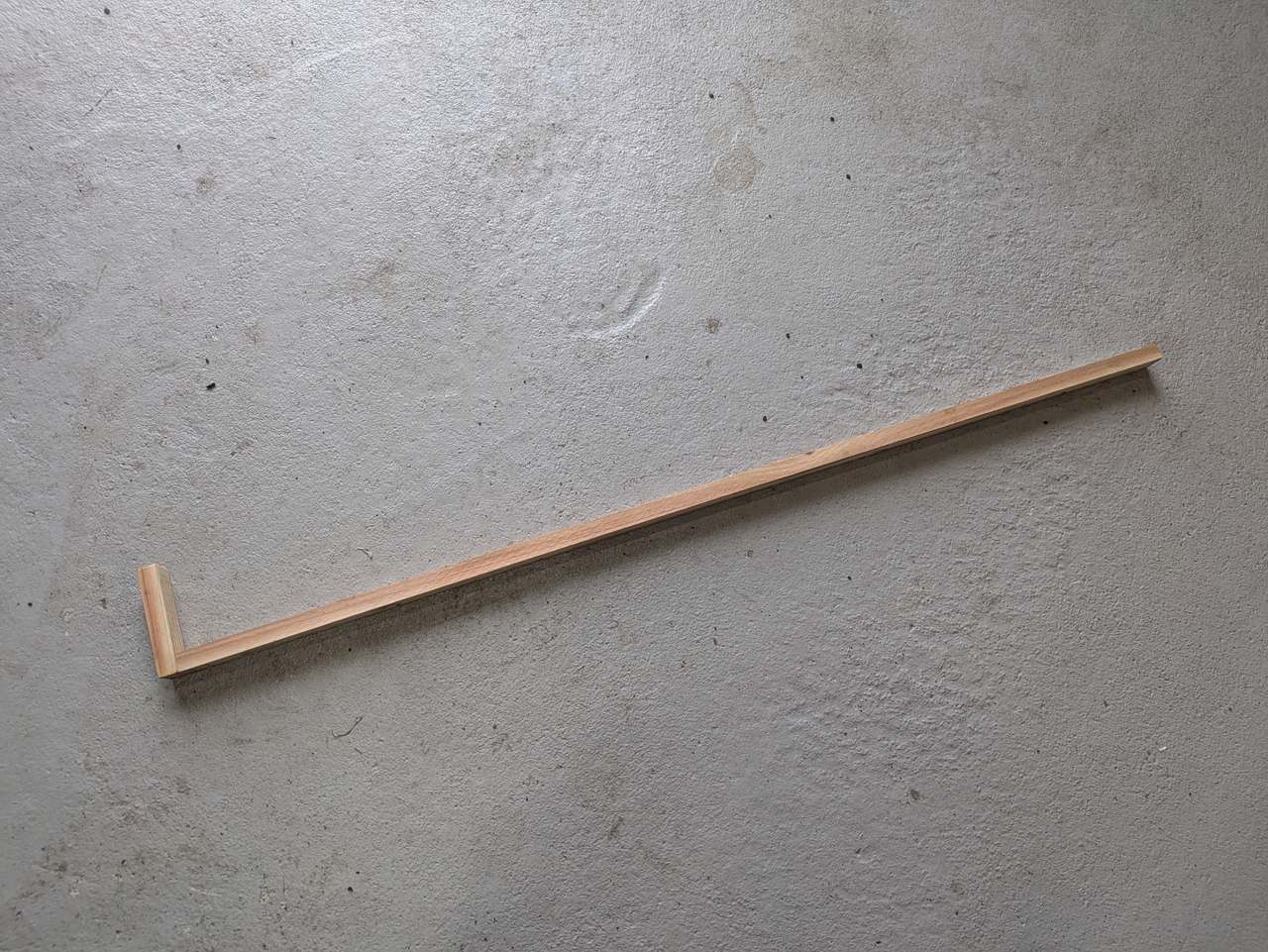 それがこれ。ただ木の棒を切ってL字にしただけ。ちなみに厚さ15mm、幅25mm、長さ1000mmの木の棒がホームセンターに売っていたのでそれを使った。お値段なんと70円。安い。