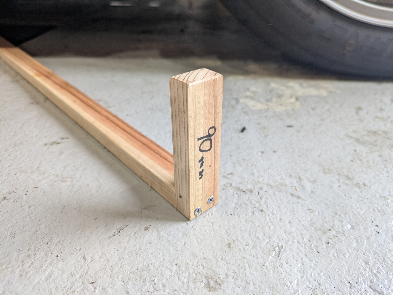 端から長さ90mmの分だけをカットして、L字になるように木ねじで固定しただけ。木ネジはそのへんにあったものなので実質無料。