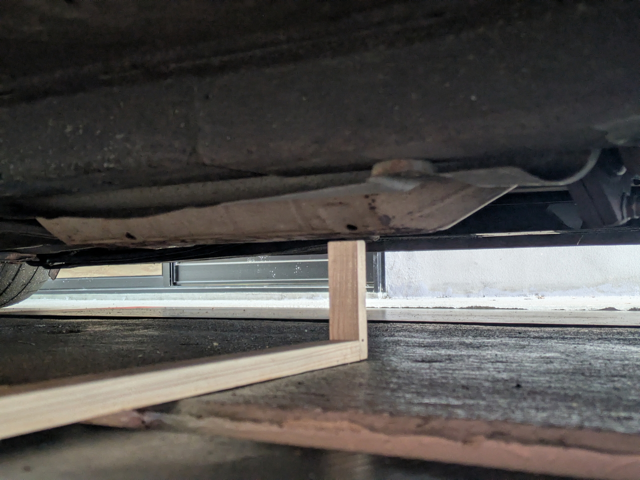 あとは水平で平らな場所に車を置いて、車の下にこの自作工具を突っ込んで最低地上高をチェックするだけ。木の先端がどこにも当たらなければ9cmの最低地上高があることが確認できる。
