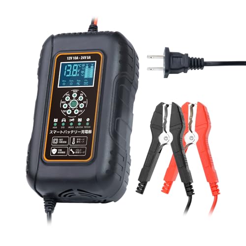 というわけで買ったのがLVYUAN(リョクエン)という謎中華メーカーのバッテリー充電器。12V/24Vのバッテリーに対応し、最大出力電流は10A。個人的な経験値として10A~15Aぐらいの電流があると普通車の充電はいい具合のスピード感でできるので、これぐらいを選びたい。