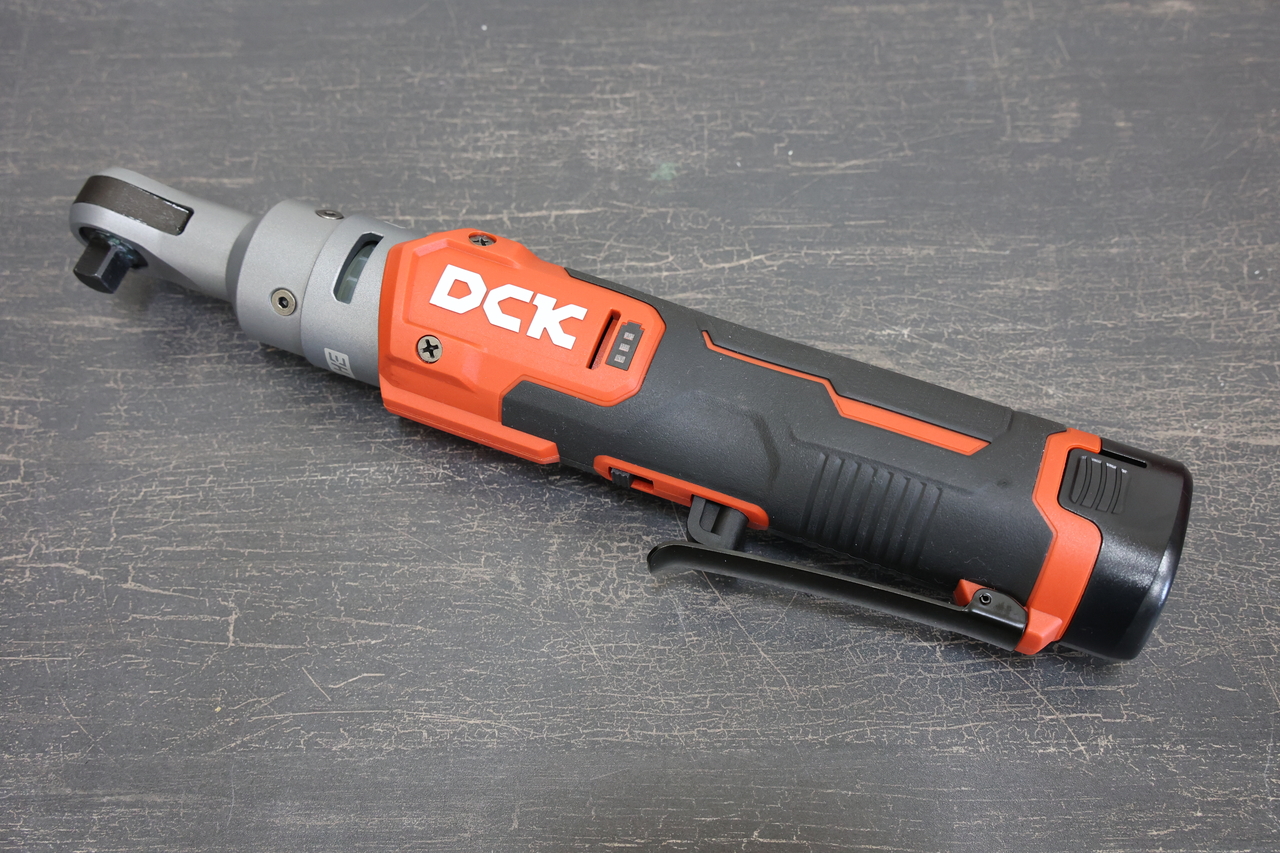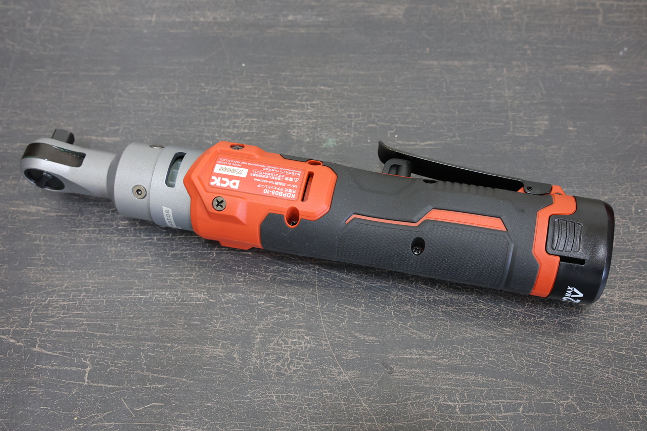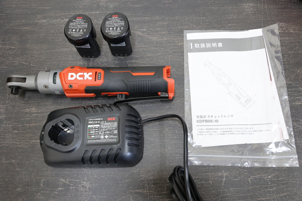 というわけで買ってみたのがDCK KDPB05-10という電動ラチェットレンチ。12Vバッテリーシリーズの商品だが、これはマキタで言うところの10.8Vシリーズと同等。マキタが定格電圧で書いてあるのに対して、DCKは100%充電時に近い状態での電圧を記載しているのと思う。ちなみにデウォルトも日本使用と本国仕様で記載電圧が異なる。おそらくどちらも定格3.6Vバッテリーを3本直列で繋いだバッテリーを使用しているはず。