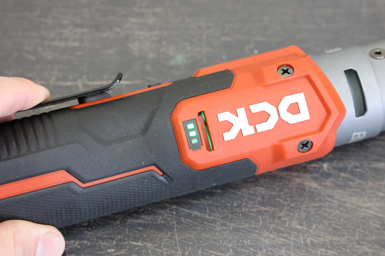 表面にはDCKのロゴと、バッテリー残量を表すインジケーターが備わる。インジケーターはトリガーを握って数秒すると点灯する仕様。このバッテリーインジケーターの3連ランプは中で繋がっている様子で、3段階のどこになるのかパット見だと分かりづらい部分が無きにしもあらず。